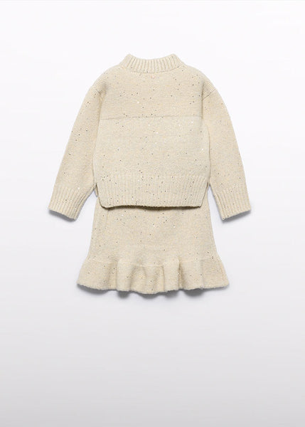 Compleu tricotat crem cu paiete mici argintii din colecția Abel&Lula. Fustita tip A cu volan, talie pe elastic. Fustita are si doua aplicatii tip buzunar cu nasturel. Pulover maneca lunga, decolteu rotund.