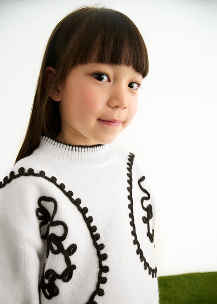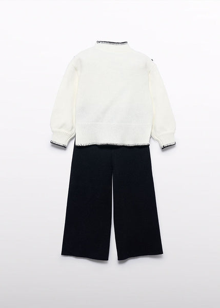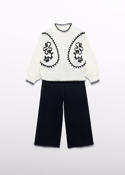Set 2 piese bluza si pantaloni tricot. Bluza alba, cu motive prodate si cusatura ornamentala la guler si mansete. Pantaloni negri lungi, tip cullote.