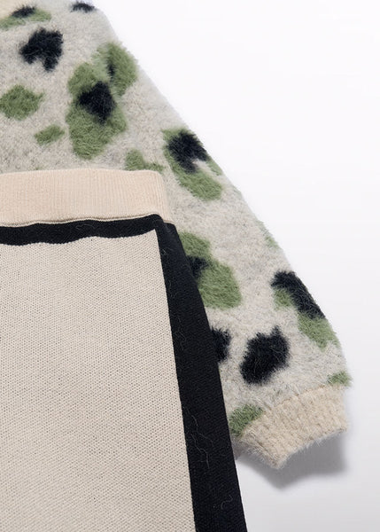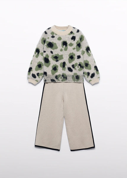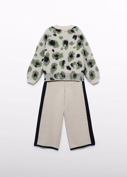 Compleu pulover imprimeu stilizat animal print si pantaloni culotte trei sferturi bej cu dunga. Material tricotat. Se poate asorta cu Caciula 5963.